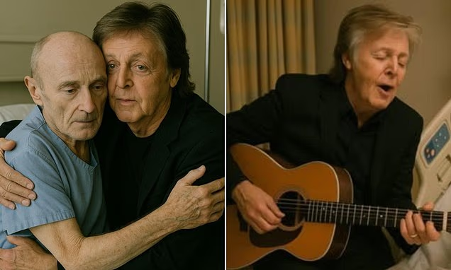 ‘On the fifth floor, Phil Collins lay still—frail and pale after months battling severe complications from spinal and heart conditions. As Paul entered the room, Phil’s eyes slowly opened, his lips trembling without sound’.
